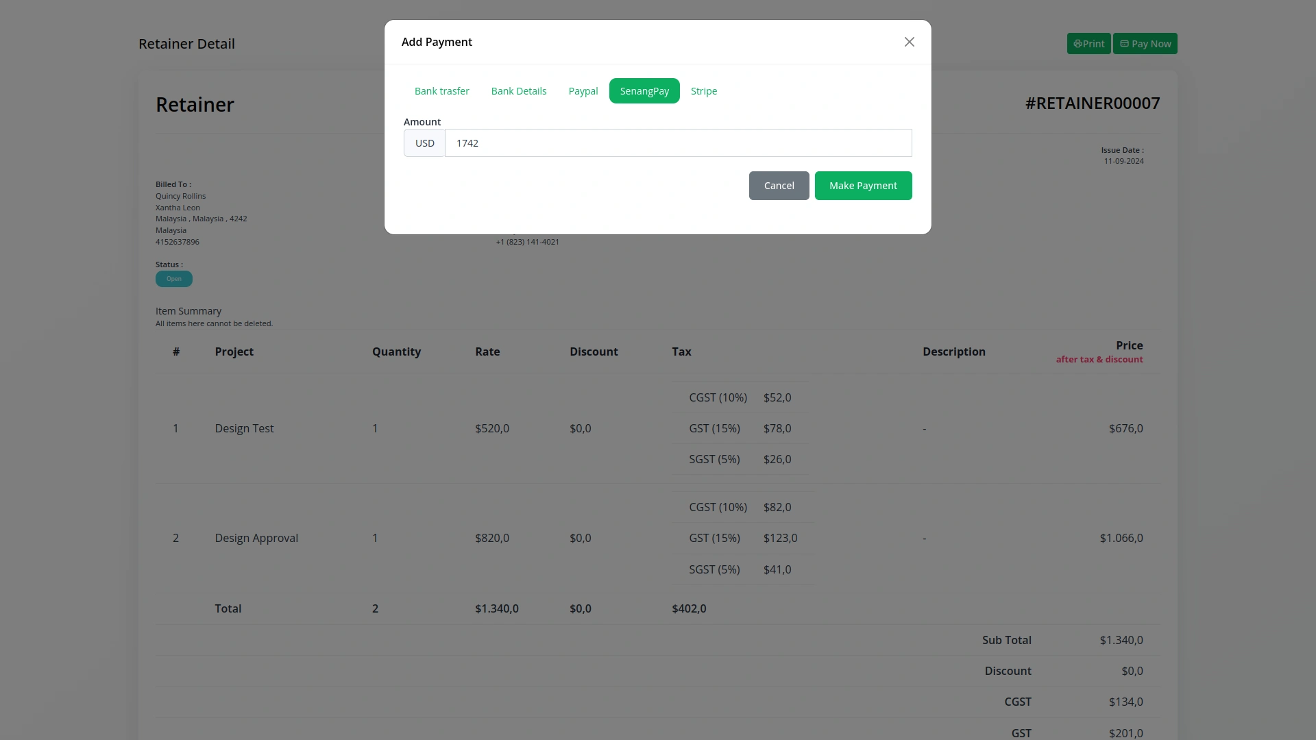 Invoices Made Easy Simplify your billing process with senangPay Payments electronic invoice generation. Create, send, and manage retainer invoices for advance payments and sales invoices for completed transactions with ease. Ensure secure delivery and provide customers with a hassle-free payment experience.