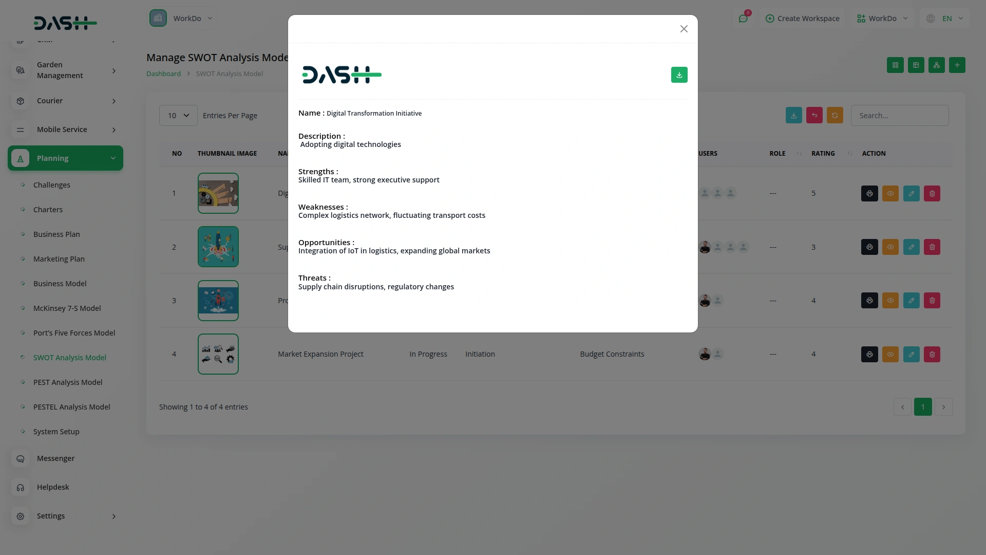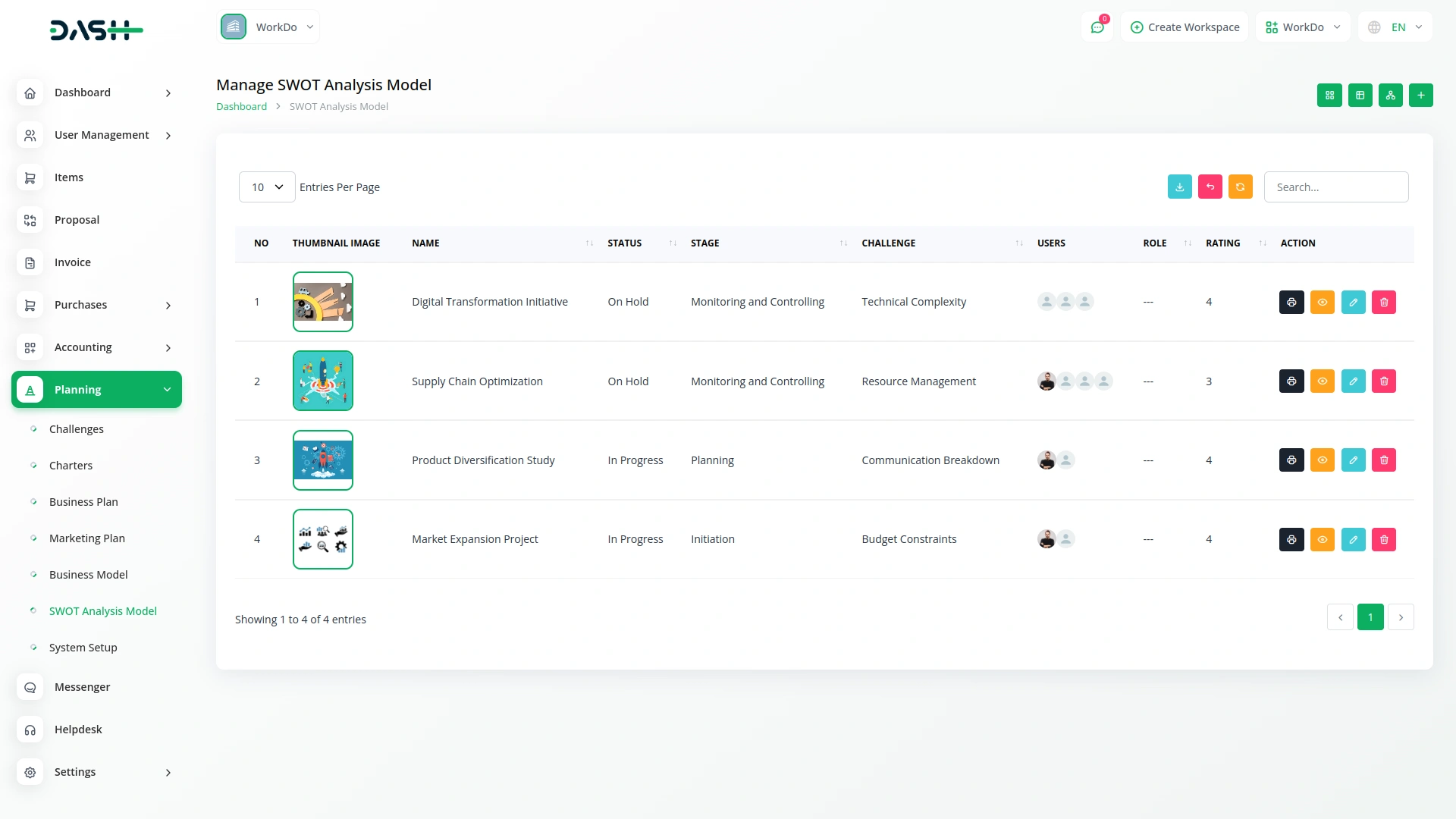 Gain a comprehensive view of your SWOT Analysis Models in an intuitive grid format. This section displays key details like strengths, weaknesses, opportunities, and threats, along with essential data such as comments, attachments, challenge end time, and assigned users. With the ability to print, edit, or delete models, this feature allows you to efficiently manage and update your SWOT analysis for actionable insights.