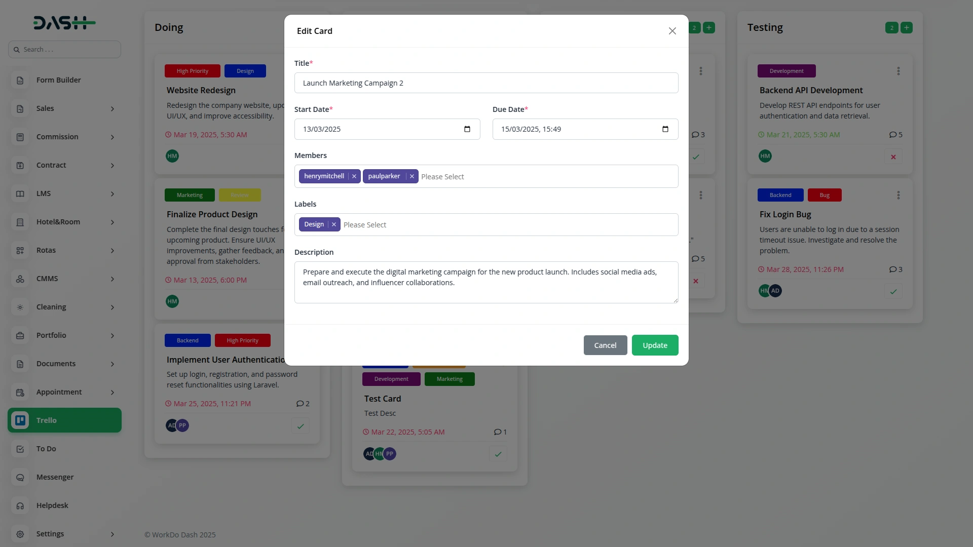 Once the integration is set up, you can manage Trello boards, lists, and labels directly within your system. Create new boards to organize your projects, add lists to structure tasks, and assign labels to prioritize work efficiently. Any updates made in your system will reflect in Trello in real time, ensuring seamless synchronization and improved team collaboration.