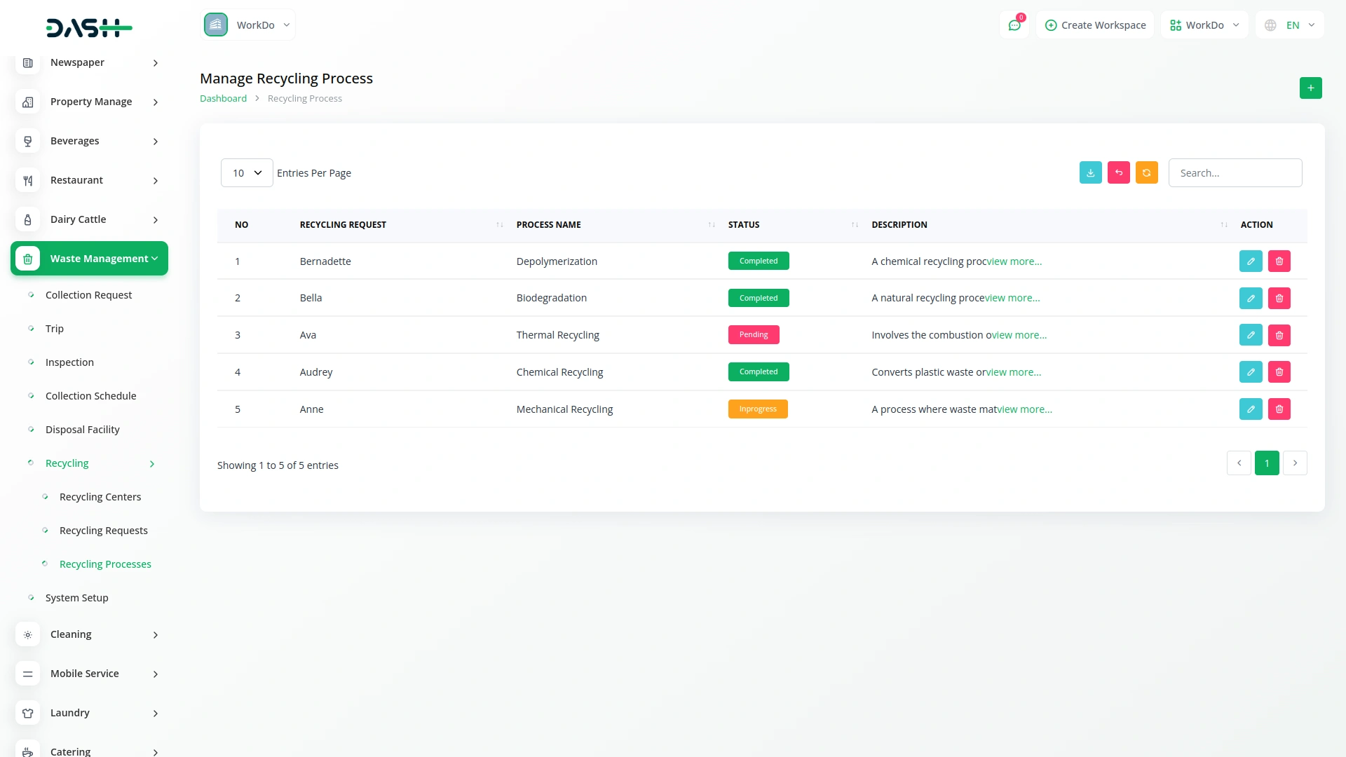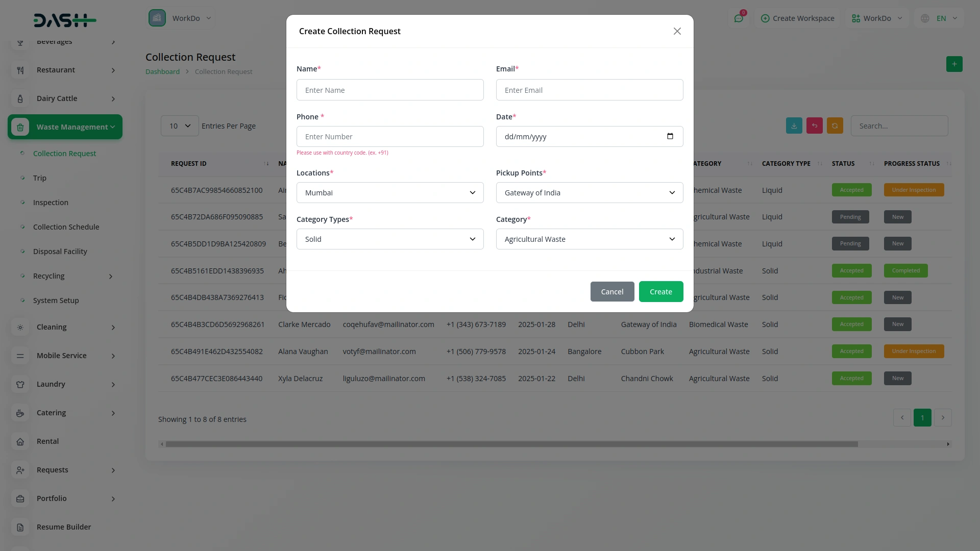 Create recycling requests tied to collections, manage processes, and track status updates like Pending, In Progress, and Completed. This ensures that every step of recycling is documented and traceable.