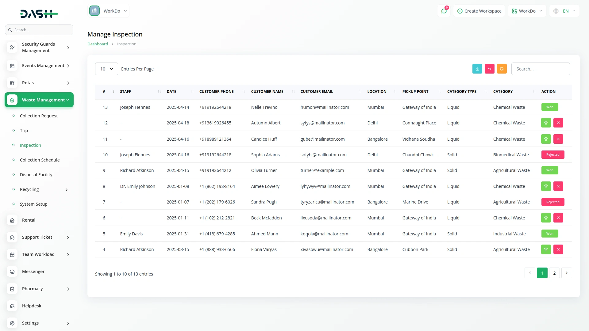 Log every waste collection trip, including staff assignments, inspection updates, and additional trip details. Monitor each trip's workflow from start to completion. This improves operational accountability and trip documentation.