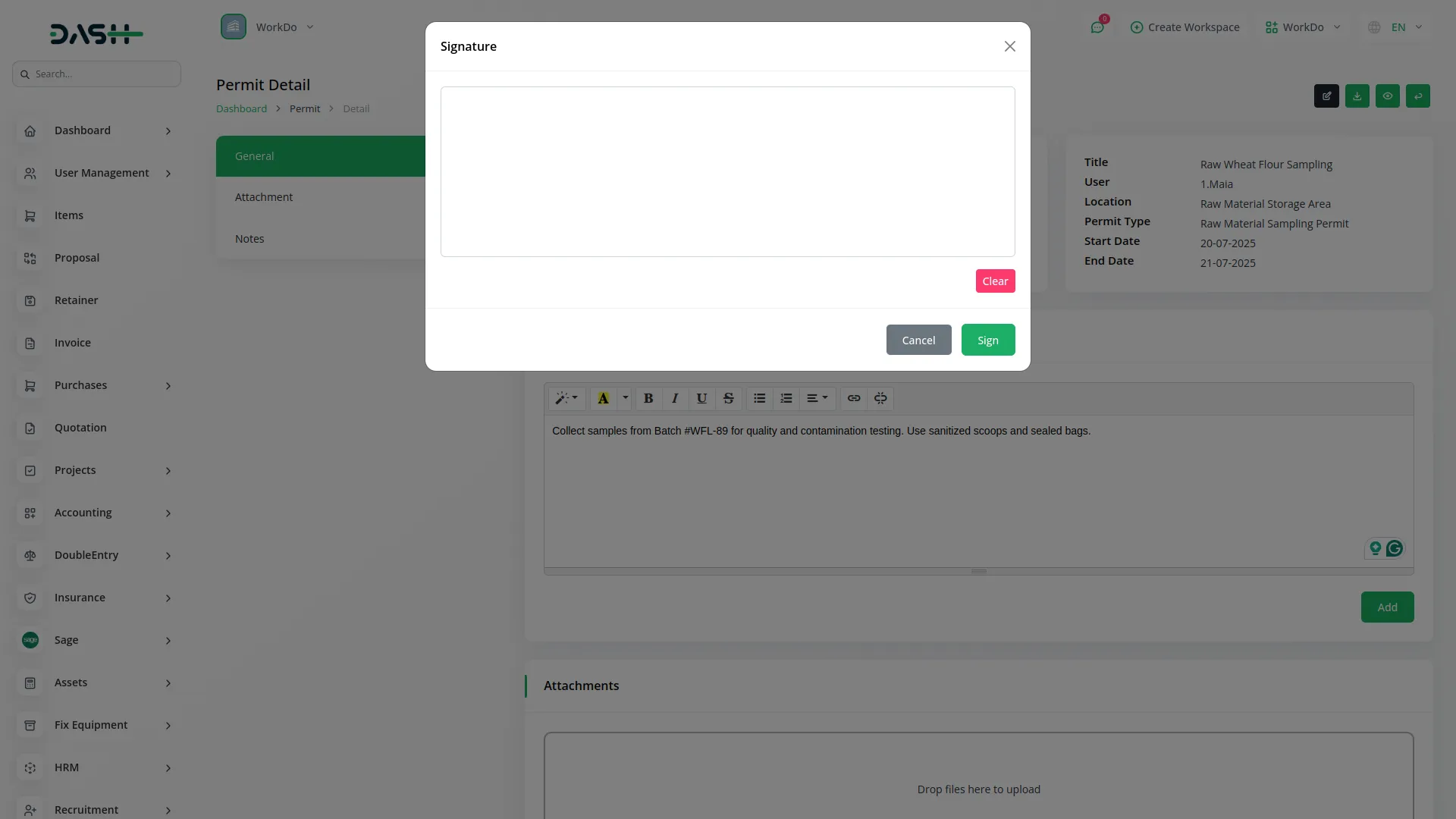 Enhance permit documentation with a robust attachment management system that supports multiple file types and formats through intuitive drag-and-drop functionality. The system maintains organized attachment libraries for each permit with download and deletion capabilities while supporting various file formats, including images, PDFs, and office documents. Dynamic note management enables detailed communication records through an integrated system that supports permit-related discussions and updates. Team members can contribute to permit discussions through the collaborative note system, ensuring all relevant information and decisions are documented and accessible to authorized personnel.