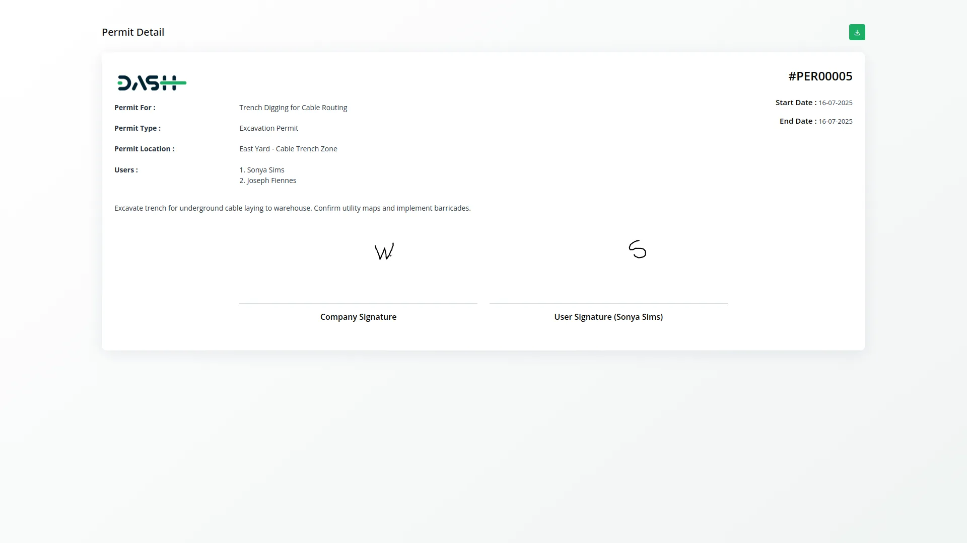 Manage permit approvals efficiently through a structured workflow system that tracks permit status from submission to completion with three status levels: pending, approved, and rejected. Authorized personnel can review permit details and make approval decisions directly from the permit management interface with clear status indicators throughout the process. The workflow system maintains complete audit trails of all approval actions and status changes, while automated status tracking ensures no permits are overlooked. Digital signature integration enhances permit authenticity and legal compliance when the signature Add-On is enabled, providing secure authentication for permit approvals.