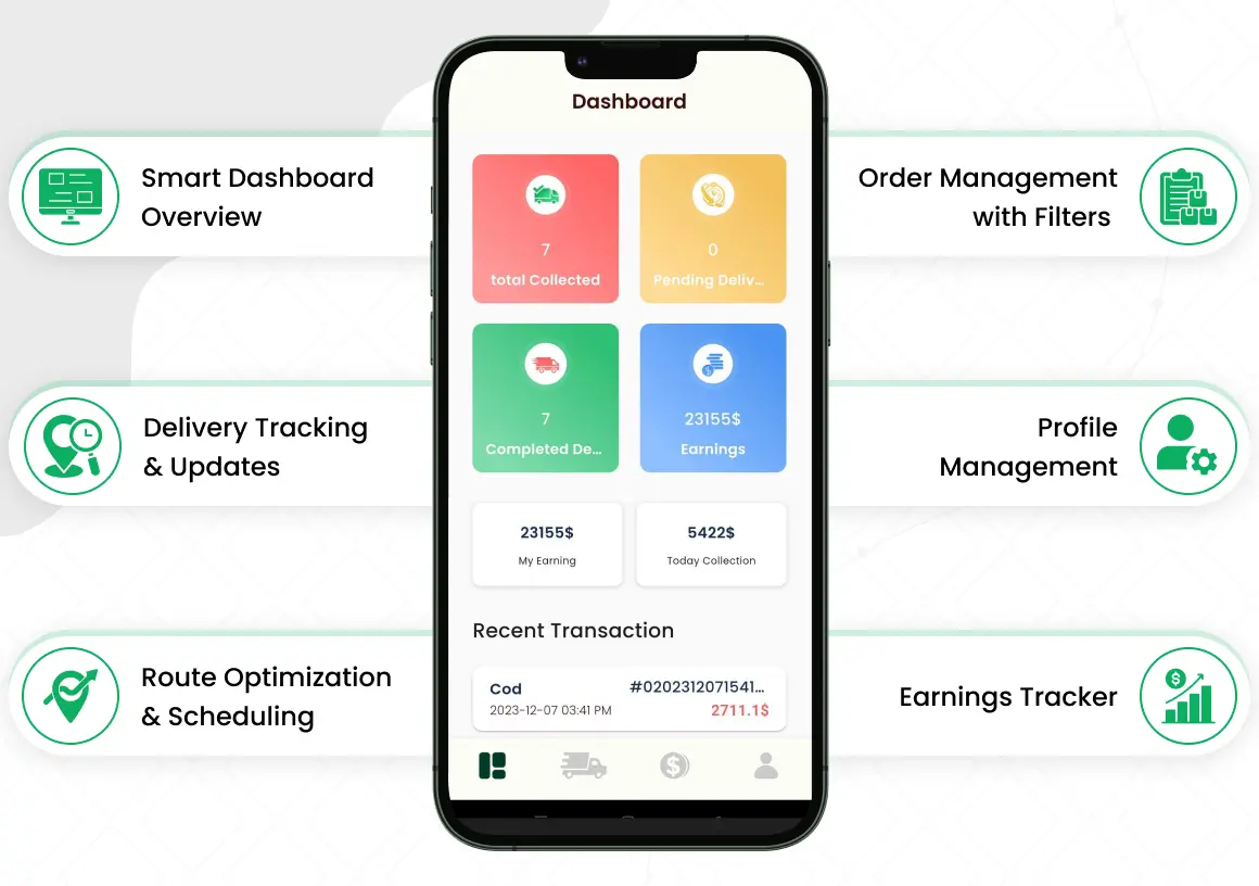 Stay on top of your performance with detailed insights into daily and total earnings. Track completed deliveries, analyze revenue, and monitor collections through this powerful delivery driver management app — designed to maximize transparency and motivation.