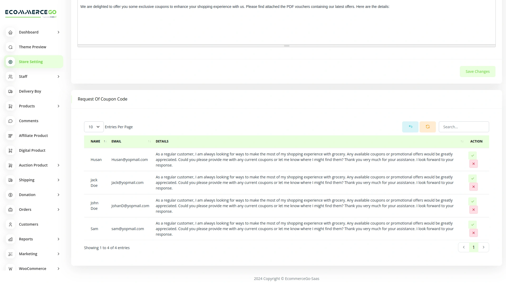 Upon receiving a coupon code request, the module notifies the admin, who can then review and approve the request. eCommerceGo SaaS provides a streamlined interface for admins to manage these requests efficiently. Once approved, the system automatically generates a PDF containing the coupon codes. This automated process minimizes the administrative burden, allowing businesses to focus on other critical aspects of their operations.