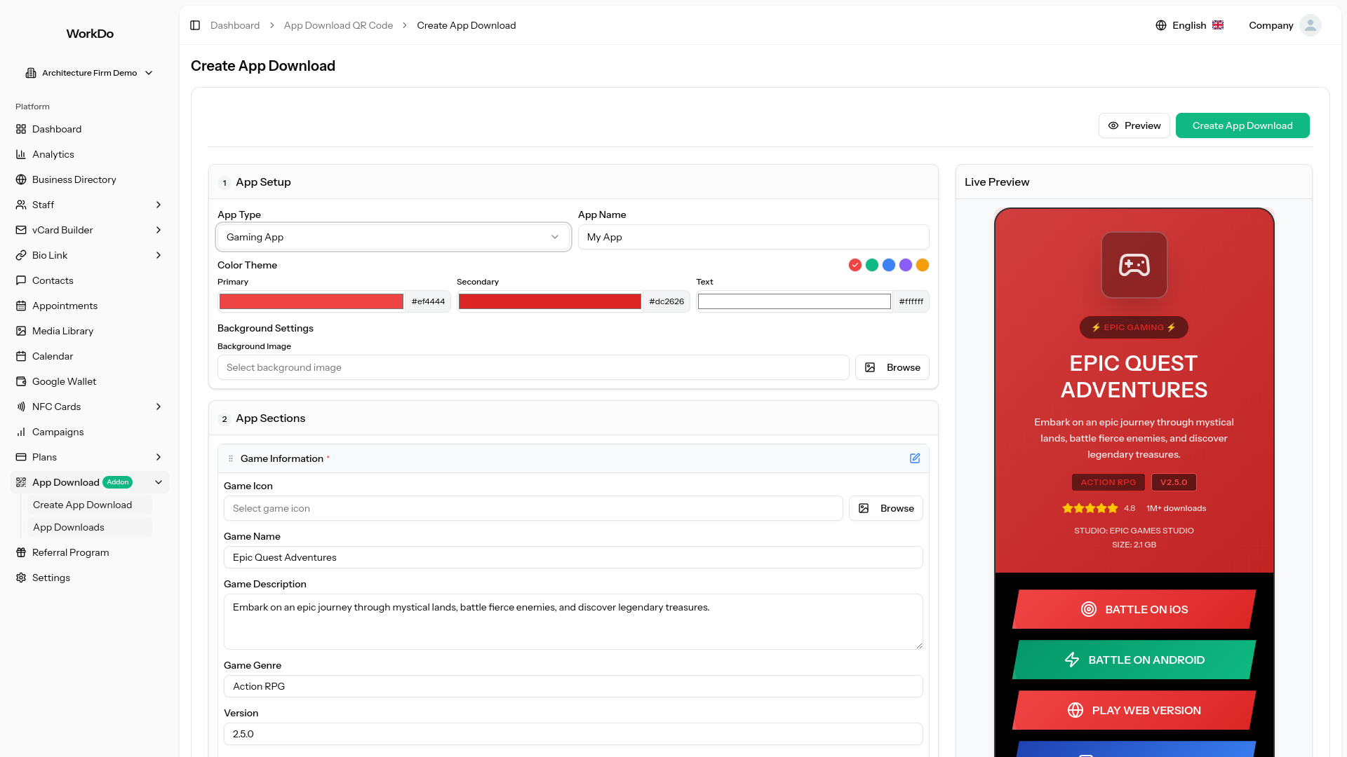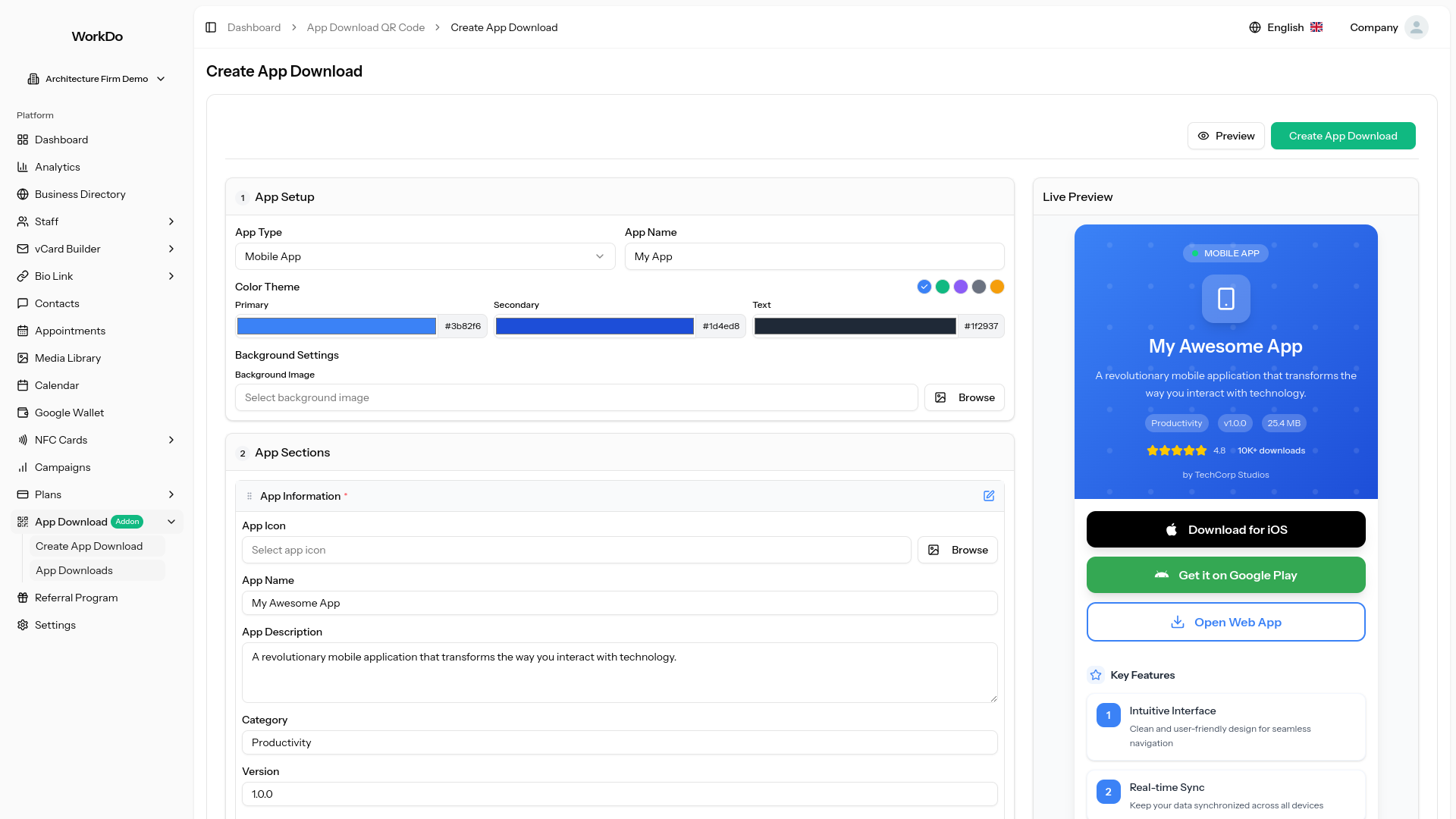 Customize layouts, colors, backgrounds, button styles, and app descriptions with real-time preview functionality across mobile, tablet, and desktop formats.