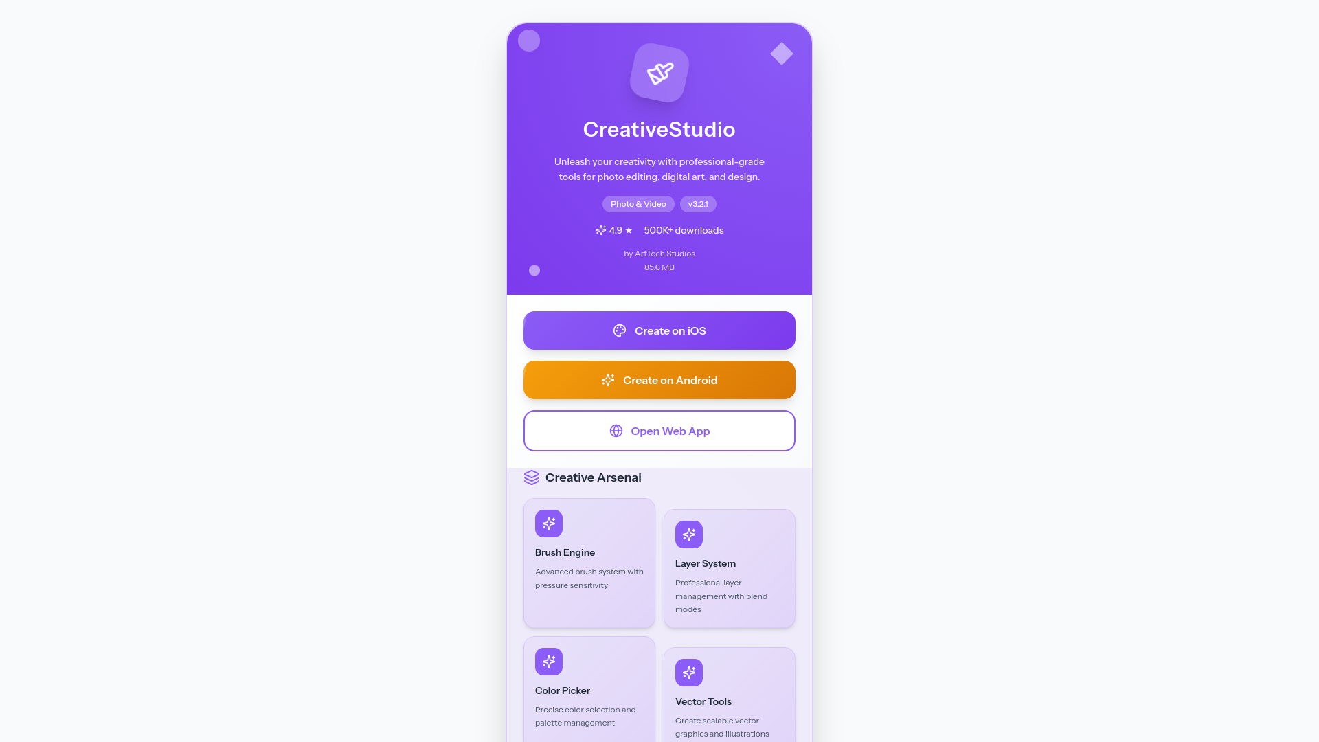 Choose from 5 specialized templates: Creative, Gaming, Lifestyle, Mobile, and Productivity themes, each optimized for different app categories and user engagement.