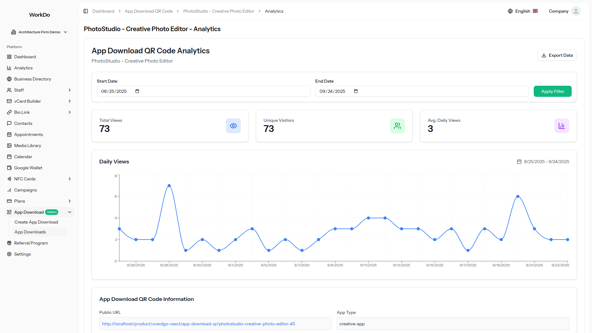 Track your app marketing success with detailed analytics showing conversion rates from landing page visits to actual app downloads. Monitor campaign performance across different platforms, identify peak download periods, and measure the ROI of your app marketing efforts. Essential data for growing your user base strategically. The addon extends analytics capabilities with platform-specific conversion funnels, geographic insights, and user behavior tracking across different traffic sources. Export functionality allows you to integrate app download performance data with your existing marketing analytics tools for comprehensive reporting.
