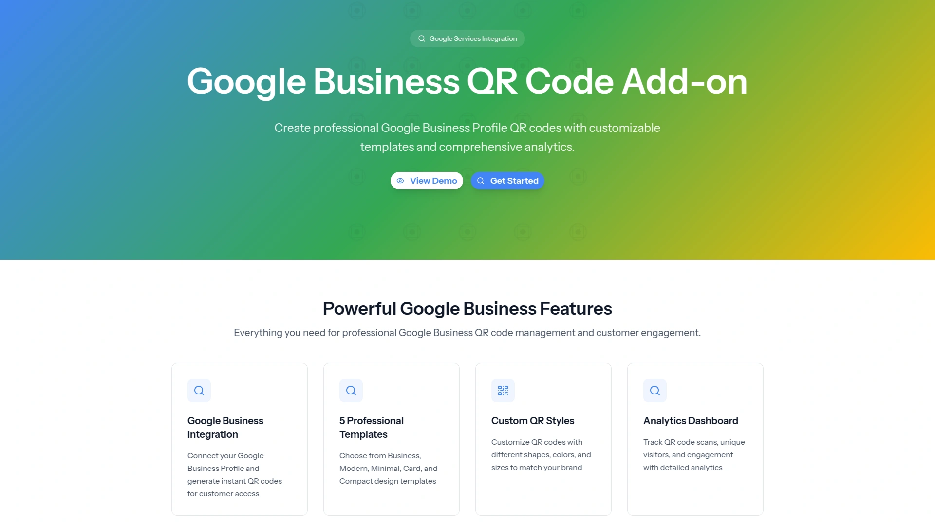 Generate high-resolution QR codes perfect for print marketing materials, business cards, storefront displays, and digital signage. The QR codes link to your branded Google Business landing page, creating a professional bridge between offline marketing and online business presence. Perfect for retail locations, service businesses, and local marketing campaigns. The addon provides multiple QR code formats and styling options, including custom colors and shapes for brand consistency.