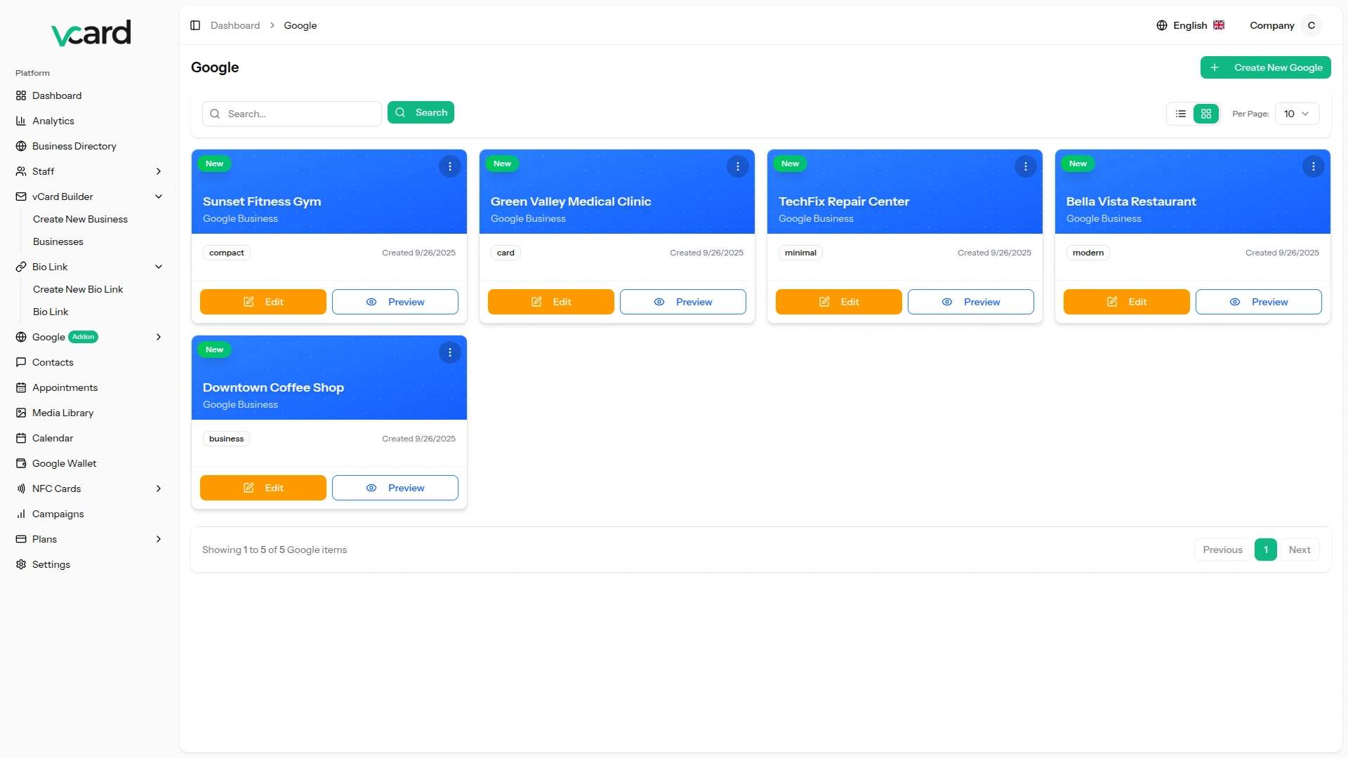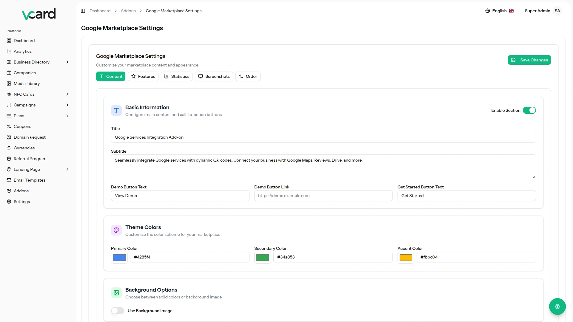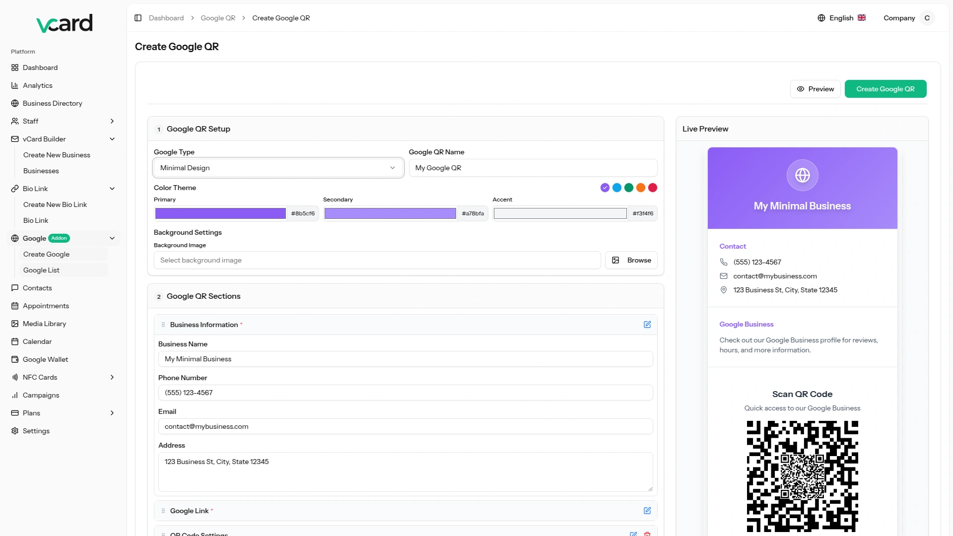 Customize colors, backgrounds, business information, and descriptions with real-time preview functionality