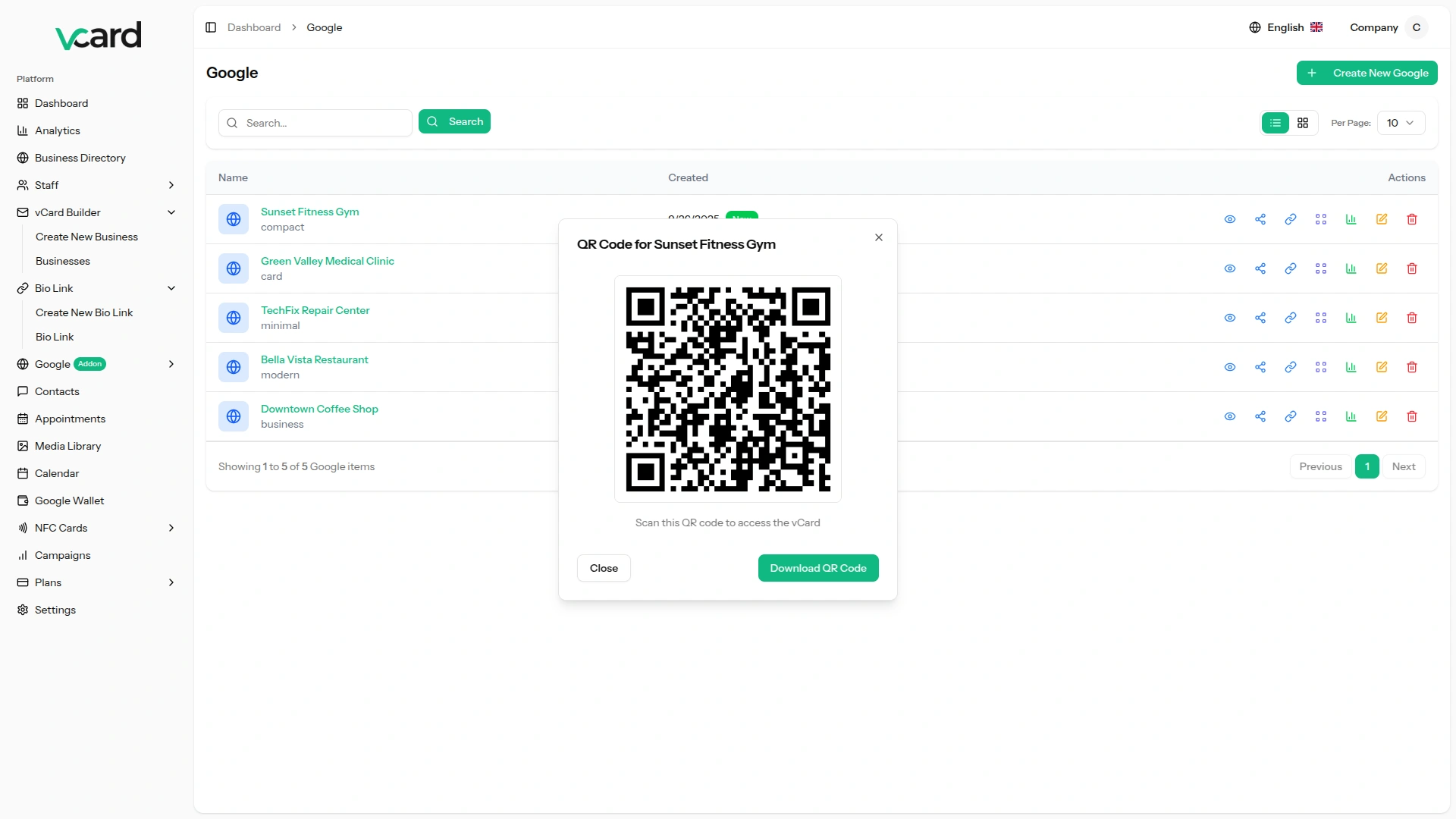 QR codes are automatically generated for each Google Business QR code you create. These high-resolution codes are print-ready and perfect for business cards, storefront displays, and marketing materials.