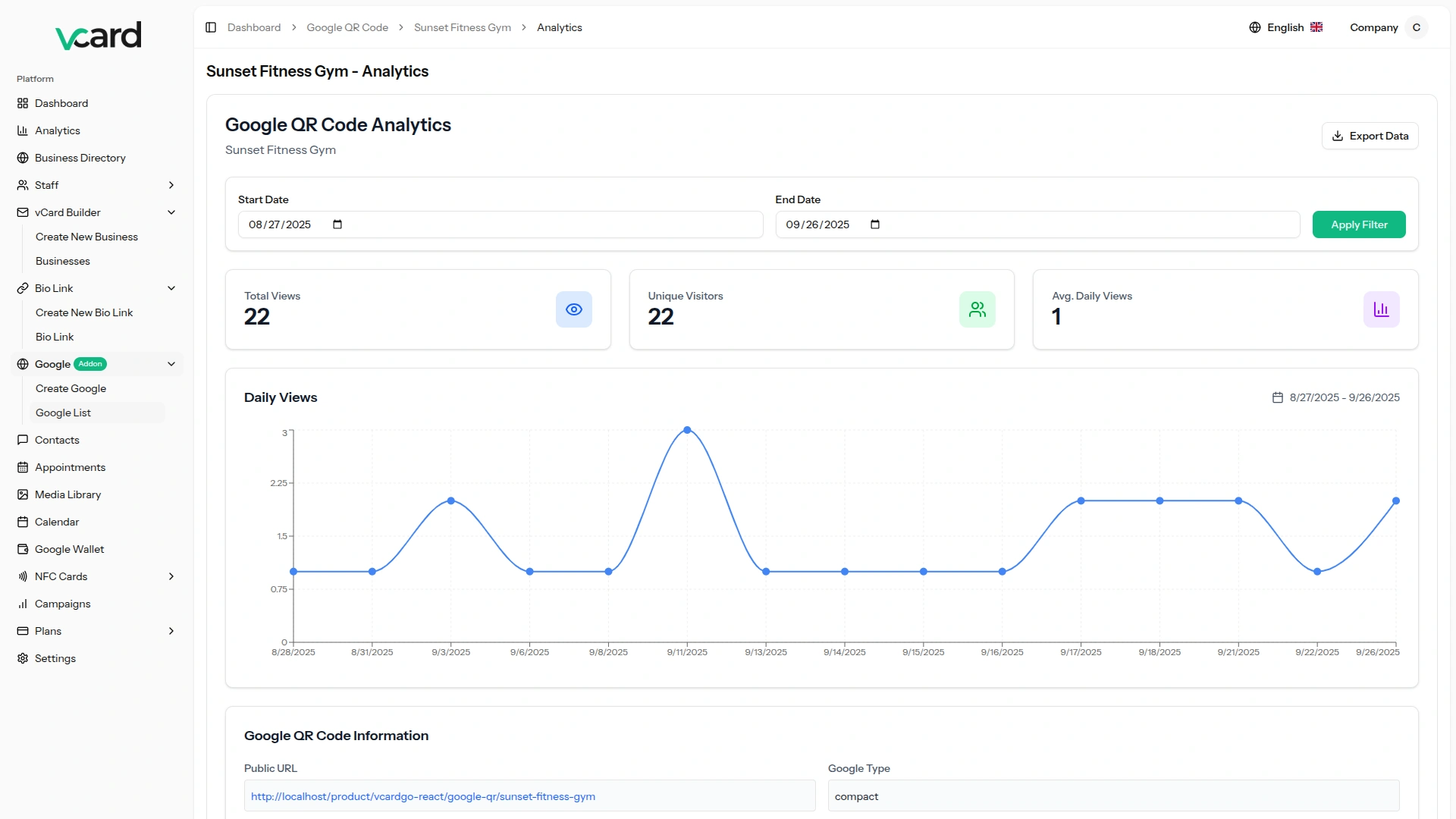 Track page views, visitor engagement, click-through rates, and Google Business Profile redirect performance with exportable reports