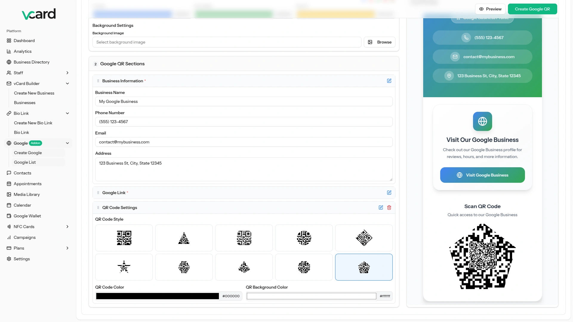 See your Google Business QR code come to life with real-time preview showing exactly how customers will experience your business page. The preview displays your chosen template, colors, business information. Make instant adjustments to design elements while seeing immediate results. The addon enhances the preview experience with interactive elements and hover effects that mirror the actual customer experience.
