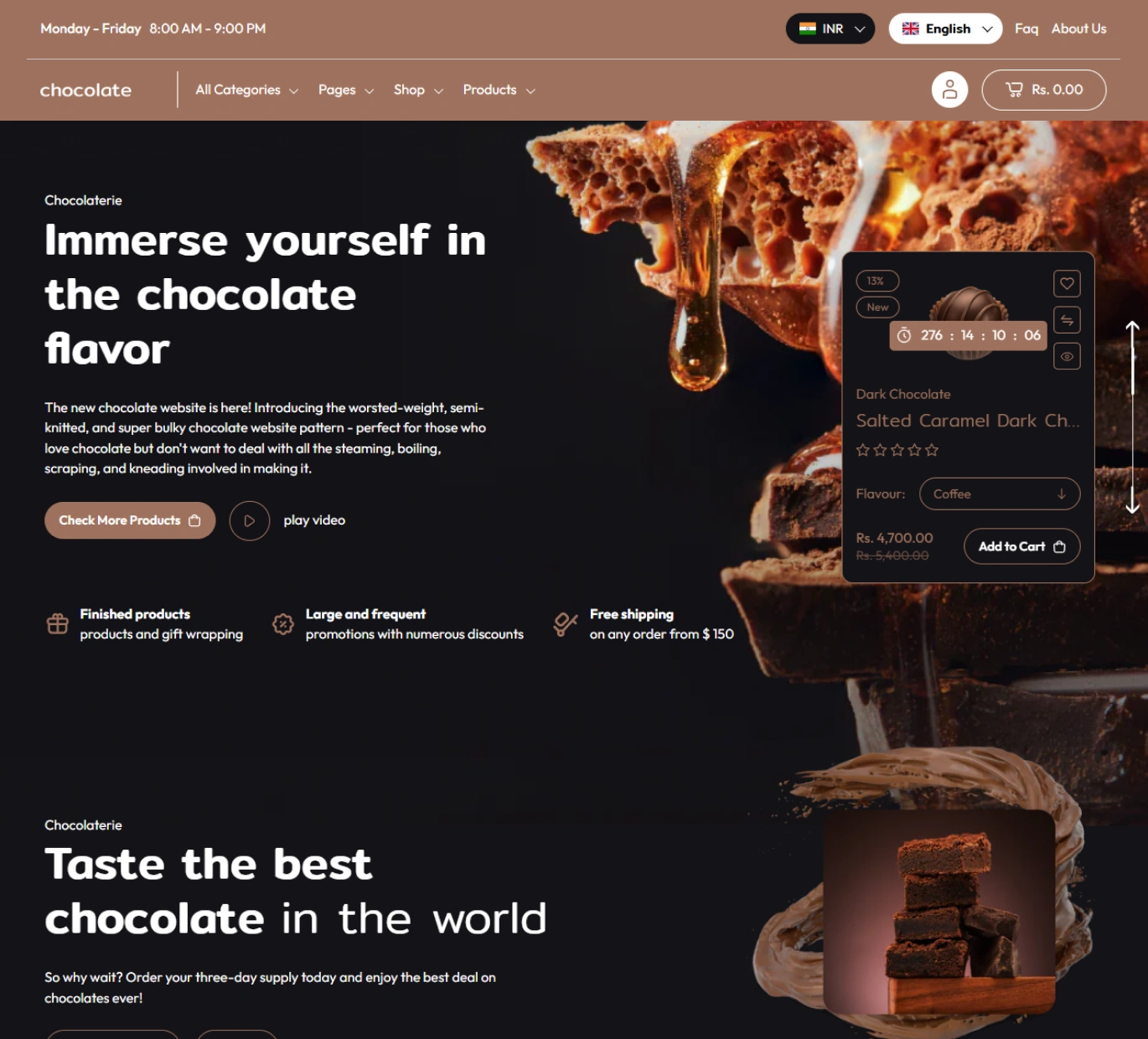 One of the key characteristics of chocolate Shopify themes is their clean, user-friendly design. The layout is simple, and the navigation is intuitive, which makes shopping for chocolate and candies a delightful experience. Whether you're offering chocolate bars, gift boxes, or cakes, the template will ensure that your products are front and center.
