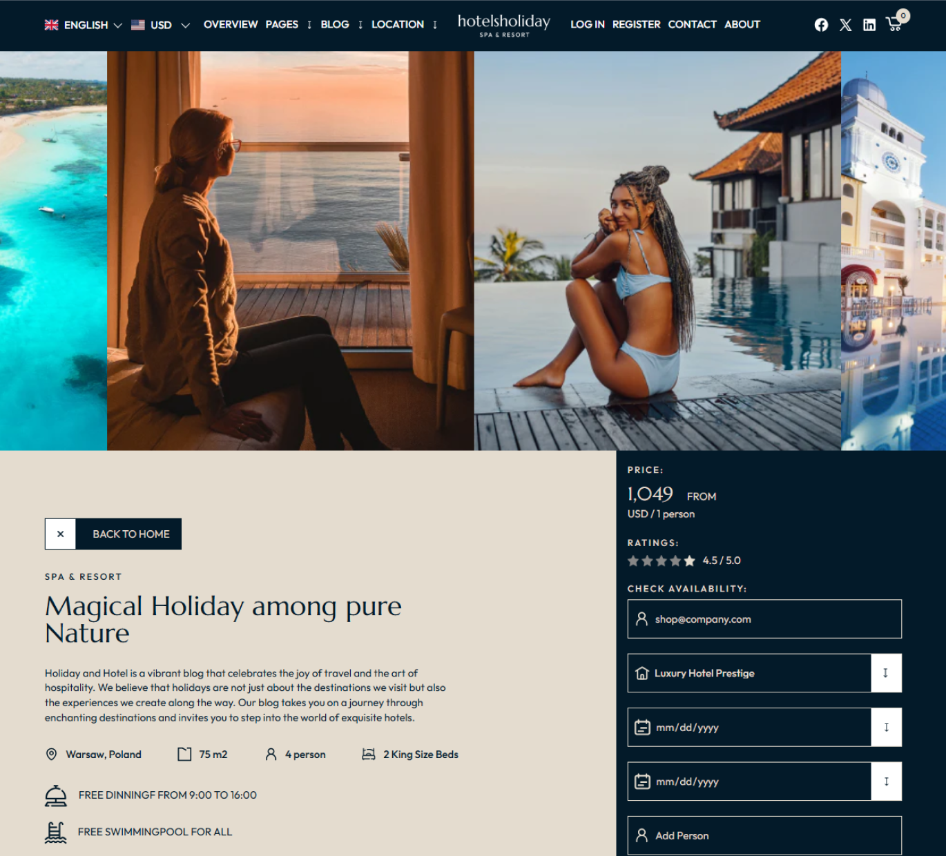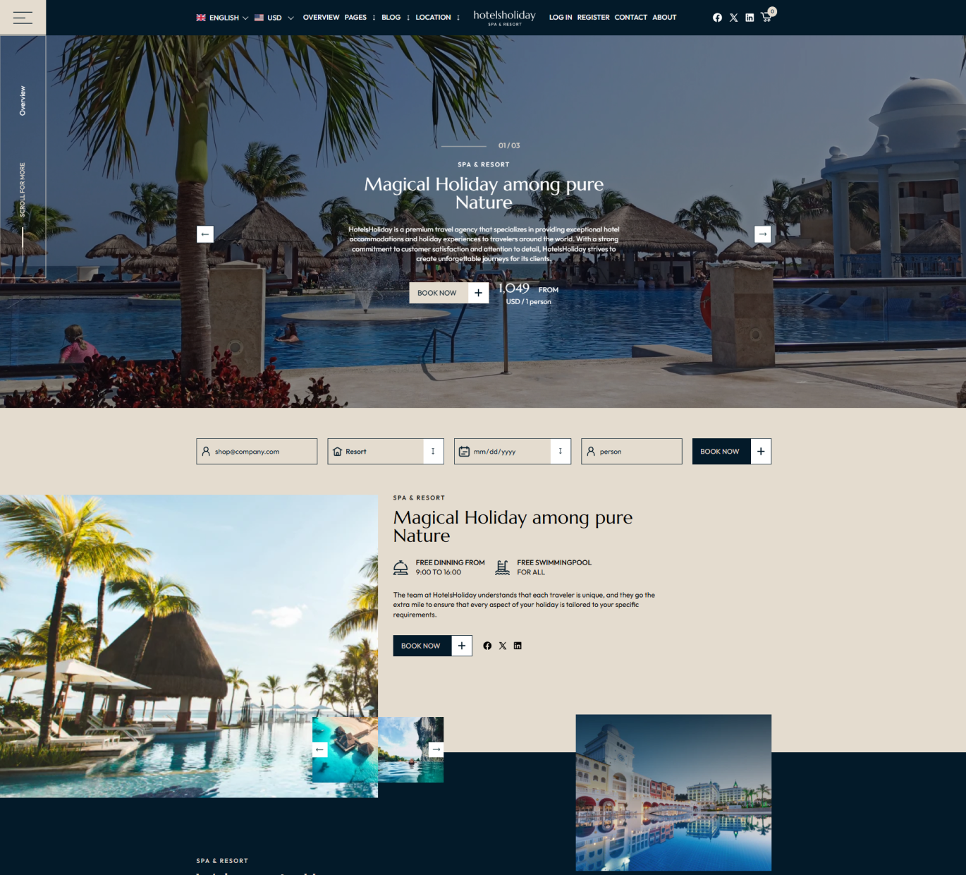 These layouts emphasize the broader experience over individual rooms. They highlight local attractions, activities, spa services, and on-site dining. This approach works well for resorts or luxury properties, where the overall experience is as important as the room itself. Many hotel website design templates come with this structure, allowing you to appeal to guests looking for more than just a place to sleep.