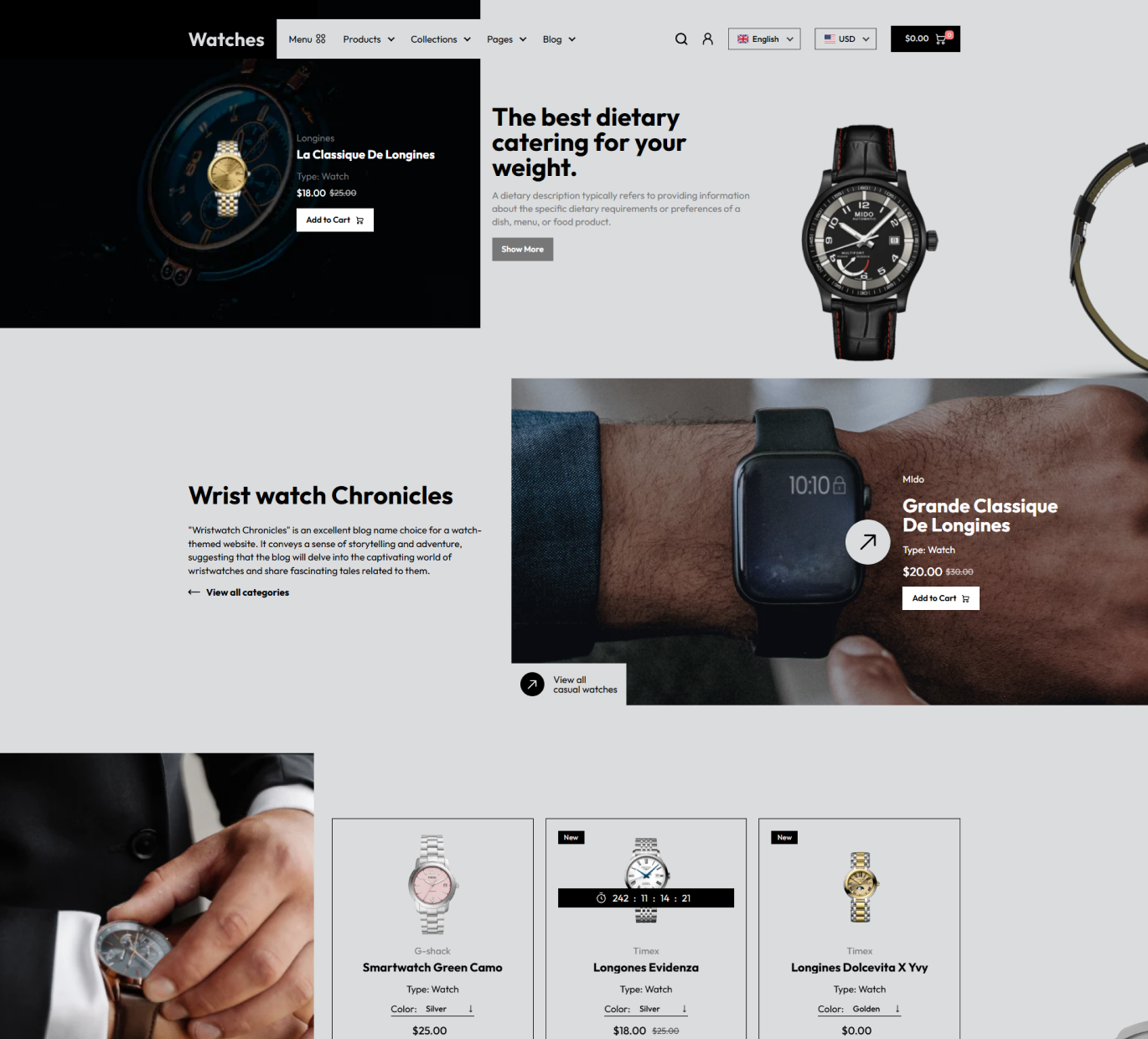 - Professional Design: Highlight watches with clean layouts, interactive galleries, and product-focused visuals.