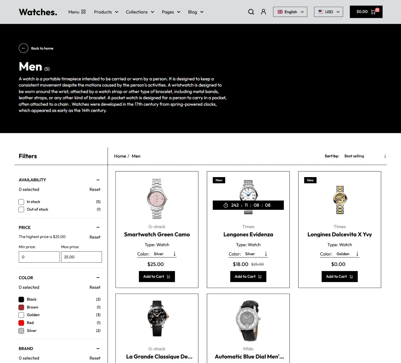 this watch shop theme supports multiple watch categories like smartwatches, luxury, or vintage collections, allowing you to display them neatly with custom filters and product layouts in your watch store template.